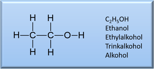 Chemisch betrachtet handelt es sich bei Ethanol um einen einwertigen, primären und linearen Alkohol, d. h. die einzige (= einwertig) OH-Gruppe steht am Ende (= primär) einer unverzweigten (= linear) Kohlenstoffkette. Ethanol ist eine klare, brennbare, farblose, angenehm riechende sowie brennend schmeckende Flüssigkeit, die sich zum einem unbegrenzt mit Wasser mischen lässt und zum anderen auch in vielen organischen Lösungsmitteln löslich ist. Die gute Löslichkeit in Benzin beispielsweise macht man sich beim Bio-Ethanol als Kraftstoff für Autos zu Nutze.