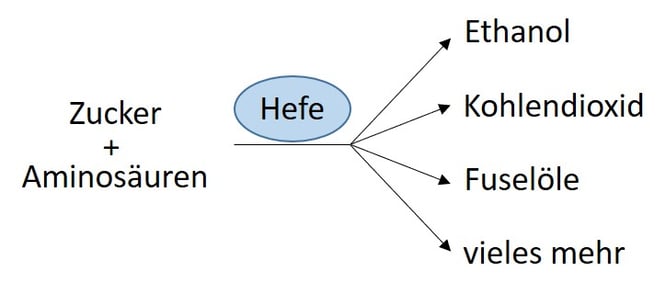 Die wichtigsten Fuselalkohole, die wir hier betrachten möchten, tragen die chemischen Namen Propanol, Isobutanol, optisch aktiver Amylalkohol, Isoamylalkohol und 2-Phenylethanol. Zugegeben, etwas kompliziert. Aber an der Endung -ol erkennen Sie, dass es sich um Alkohole handelt. Diese werden auf biochemischem Wege aus den natürlich vorkommenden Aminosäuren Threonin, Valin, Isoleucin, Leucin und Phenylalanin gebildet, die in Form von Proteinen in der Gerste enthalten sind. Ja, hier steckt wiederum, wie fast immer in der Chemie, Methode dahinter, denn fast alle natürlich vorkommenden Aminosäuren enden auf -in. Die Umwandlung von Aminosäuren zu den entsprechenden Fuselalkoholen in der Hefezelle geschieht – vereinfacht gesagt – folgendermaßen: Die Enzyme der Hefe zerlegen zunächst die Proteine der Gerste in die einzelnen Aminosäure-Bausteine. Anschließend wird aus der jeweiligen Aminosäure die Stickstoff-haltige Aminogruppe entfernt, dann Kohlendioxid abgespalten und zum Schluss der verbliebende Rest zum Fuselalkohol reduziert.