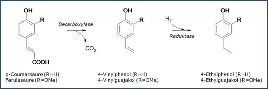Im Gegensatz zur Bierherstellung wird bei der Whiskyproduktion die Würze nicht bis zum Kochen erhitzt. Daher gelangen die Bakterien, die auf der gemälzten Gerste befinden, in den Fermentationsprozess. Viele Getreidearten, so auch Gerste, sind reich an Hydroxyzimtsäuren. Dies sind aromatische Säuren, die mit den Hydroxygruppen der Zellwand der Gerste verestert sind. Viele Mikroorganismen besitzen die Fähigkeit, diese Hydroxyzimtsäuren zu decarboxylieren, d.h. aus ihnen Kohlendioxid (CO2) abzuspalten. Daher werden diese Decarboxylasen genannt. Somit entstehen z.B. aus der Ferulasäure (trans-4-Hydroxy-3-methoxyzimtsäure) und der p-Coumarsäure (trans-4-Hydroxyzimtsäure) die entsprechenden flüchtigen Phenol-Derivate 4-Vinylguajakol und 4-Vinylphenol. Diese Verbindungen haben charakteristische medizinische, phenolartige Aromen und kommen maßgeblich in Islay-Whiskies vor, die zum Teil mit über Torfrauch gedarrtem Malz hergestellt werden. Die o.g. Phenol-Derivate können anschließend durch weitere Enzyme (Reduktasen) zu den entsprechenden Produkten 4-Ethylguajakol bzw- 4-Ethylphenol reduziert werden. Durch diese bakteriellen und enzymatischen Reaktionen von im Malz befindlichen organischen Verbindungen gelangen somit phenolische Aromastoffe in die Würze und letztendlich in den Whisky, obwohl beim Darren des Malzes keinerlei Torfrauch, wie z.B. in den meisten Destillerien der Speyside üblich, verwendet wurde. Diese phenolischen Aromen sind bei weitem nicht so stark ausgeprägt wie bei dem Malz, welches in Port Ellen für die meisten der Islay-Destillerien hergestellt wird, kann aber durchaus im späteren, fassgereiften Whisky als feine phenolische Note wahrgenommen werden.