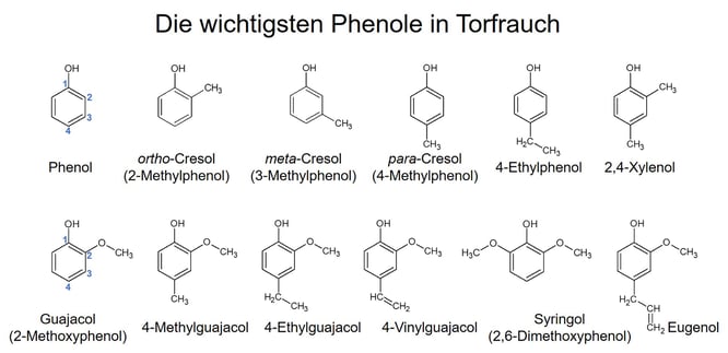 Zu den wichtigsten Phenolen im Torfrauch zählen: