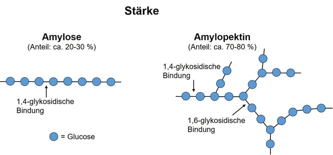 Je nachdem, wie die einzelnen Glucose-Einheiten miteinander verbunden sind, unterscheidet man in der Stärke zwei Hauptkomponenten: Amylose und Amylopektin. Amylose besteht aus langen, spiralig