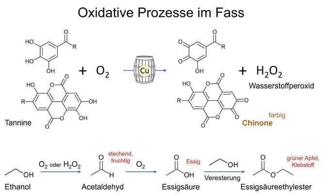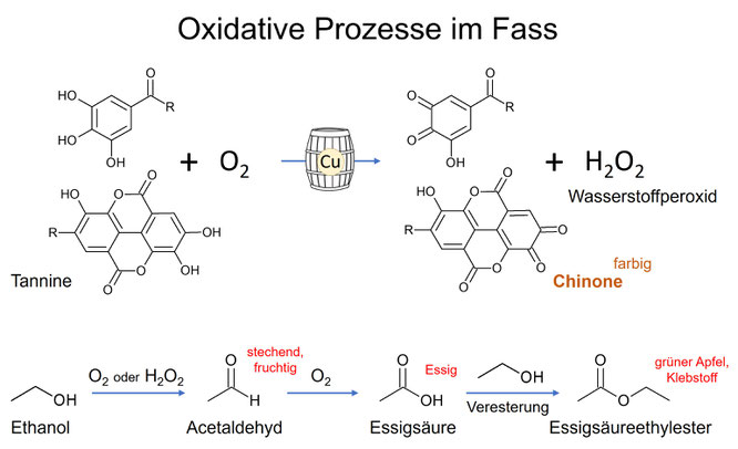 Wasserstoffperoxid ist sehr reaktiv und kann dazu beitragen, dass Ethanol zu Acetaldehyd oxidiert wird. Fehlen die Tannine, etwa in stark gebrauchten und dadurch ausgelaugten Fässern, verlangsamen sich einige entscheidende Reifungsprozesse.