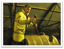 Drinnen angekommen befinden wir uns im Warehouse von Bruichladdich. Hier ruhen die Schätze in diversen Eichenfässern, bis sie auf dem Höhepunkt ihrer Reife in Flaschen abgefüllt und in die Welt hinaus verschickt werden. Jim hat einen kupfernen Valinch und einen überdimensionalen Korkenzieher bei sich, mit dem er das erste Fass öffnet und eine Probe des dunkelgefärbten Inhalts ins Glas füllt. Wir bekommen alle einen gut dimensionierten Dram in unser Glas und kosten. Der Whisky schmeckt phantastisch. Dann lenkt er unsere Aufmerksamkeit auf einen vierfach destillierten New Spirit, der sich bereits seit 18 Monaten in einem Sherry Fass befindet. Jim erzählt uns, dass er eines Abends im Still House die Idee hatte, einen vierfach destillierten Whisky zu kreieren, wie es bereits vor gut 200 Jahren auf Islay gar nicht so unüblich war. Mit einer Probe und der Warnung von Jim, dass dieser Spirit noch gut 88% Alkohol besitzt, probieren wir das nahezu schwarze Destillat. Es schmeckt vorzüglich, gar nicht so scharf wie erwartet. Nun blüht Jim so richtig auf. Er merkt, dass wir sowohl Ahnung von der Materie haben als auch Begeisterung für schottische Single Malts mitbringen und springt von einem Fass zum anderen, öffnet dieses und füllt uns eine Probe ab. Wir probieren verschiedene Finishes aus Sherry-, Syrah- und Château d’Yquem-Fässern, einige Murry McDavid Abfüllungen, Blacker Still und den neuen PC7. Nach 12 Einzelfass-Abfüllungen habe ich es aufgegeben, mitzuzählen. Barbara versorgt uns zwischendurch immer wieder mit Wasser, um unsere mittlerweile doch arg strapazierten Geschmacksknospen auf das nächste Abenteuer vorzubereiten, während draußen der Regen lautstark auf das Blechdach prasselt. Nach geschätzten 45 Minuten im Warehouse geht es noch kurz zur hauseigenen Abfüllanlage und zur Verpackungsstation. Tief beeindruckt geht es nach großer Verabschiedung von Jim, der sich auf dem Weg nach Glasgow zu einer Whiskyveranstaltung machen muss, mit Barbara wieder zurück ins Visitor Centre. Hier haben wir die Gelegenheit, den Valinch, eine hauseigene Single Cask Abfüllung, direkt aus dem Eichenfass in eine 0,5l Flasche abzufüllen und selbst zu etikettieren. Natürlich macht jeder von uns von dieser einmaligen Gelegenheit Gebrauch, zumal Barbara dann noch jede Flasche zum Andenken signiert. Nach einigen Abschlussfotos und einem Dram PC6 geht nach herzlicher Verabschiedung weiter Richtung Bowmore.