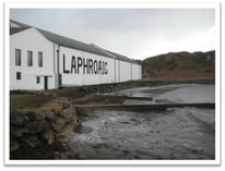 Wir fahren ein paar Meilen weiter Richtung Osten und sehen auf der linken Seite eine große Wiese mit einigen Fähnchen darauf und einem Hinweisschild, dass hier die Friends of Laphroaig ihr gepachtetes Stückchen Land finden können. Rechts ist eine Gruppe von weißen Häusern mit den typischen schwarzen Pagodendächern. Obwohl ich noch nie zuvor dort war, kommt mir alles sehr vertraut vor, da ich diese Destillerie von vielen Bildern her kenne. Laphroaig – einer meiner Lieblingswhiskys. Wir gehen zur Anmeldung, um die Tour um 10:15 Uhr mitzumachen. Der Guide sieht uns an und meint dann, dass um 10:15 keine Tour stattfindet, sondern erst um 14:15 Uhr. Wir sollten dann wieder kommen. Offensichtlich hatte er keine Lust, schon so früh zu arbeiten oder wir waren einfach zu wenige, als dass es sich gelohnt hätte, für diese Handvoll Leute eine Führung zu machen. Wie dem auch sei, wir waren ziemlich enttäuscht und fragten, ob man wenigstens den Shop für uns aufschließen würde. Dieser Aufforderung kommt man dann nach einigen Minuten nach. Leider sind dort nur die gängigen Standardabfüllungen käuflich zu erwerben. Keine von mir erhoffte Flasche mit der Feis Isle Abfüllung von 2007 ist vorhanden. Ich kaufe mir einen Laphroaig Wasserkrug und nach einigen Fotos ausserhalb der Destillerie fahren wir doch sehr enttäuscht weiter zu Lagavulin.