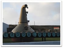 Nach ein paar Meilen hat man rechts einen schönen Blick auf die weißen Häuser mit den Pagodendächern darauf und im Hintergrund das dunkelblaue Meer. Genau wie auf den Fotos, die ich in den zahlreichen Magazinen und Bildbänden zuhause gesehen habe. Nur das hier live! Live ist auch der Regen, welcher plötzlich einsetzt. An der Hofeinfahrt steht eine ausrangierte Brennblase von Ardbeg. Hier kann man mal sehen wie groß diese wirklich sind, da man im Still House immer nur den oberen Teil davon zu Gesicht bekommt. Die wenigen Meter vom Parkplatz zum Eingang des Visitor Centres reichen aus, um bei nahezu waagrechtem Regen ziemlich nass zu werden. Das Visitor Centre beinhaltet neben einem Shop auch ein Cafe, dessen Speisen auf der ganzen Insel gelobt werden. In der Tat schmecken die Soup of the day und ein Sandwich wirklich lecker und geben wieder Kraft für die anstehende Tour. Laut Emma, der Bedienung im Cafe, soll diese aber erst in einer Stunde stattfinden, da momentan im Cafe sehr viel Betrieb ist.
