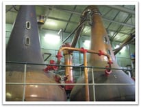 Wir beginnen die Tour mit dem Mahlen des Malzes, welches vom Festland kommt. Bruichladdich wird aber zunehmend von Farmern auf Islay direkt beliefert. Derzeit sind es bereits zwölf Farmen, die Bruichladdich mit der notwendigen Gerste versorgen. Im Gegensatz zu den anderen Destillerien auf Islay wird das Malz bei Bruichladdich mittels einer alten Holzmühle aus dem Jahre 1913 gemahlen. Weiter geht es zu den Mash Tuns – einem riesig großen, oben offenen Behälter, in dem ein krakenartiges Rührgerät den Grist, das gemahlene Malz, mit Wasser verrührt. Daneben befinden sich die aus Holz bestehenden Wash Backs, in denen die Fermentation der zuckerhaltigen Lösung, der Wash, mittels Hefe abläuft. Während der Deckel kurz geöffnet wird, um das schäumende Gebräu von oben beobachten zu können, sehe ich den Gang entlang zum Still House hinüber, in dem ich einen Mann mit gelber Signalweste zwischen den einzelnen Brennblase und vor dem Spirit Safe stehen sehe.