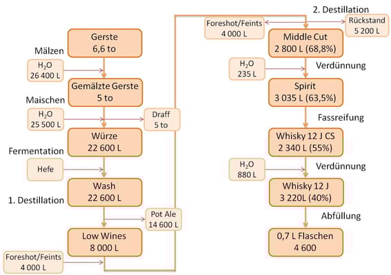 In diesem Beispiel setzt eine Destillerie 5 Tonnen (to) Gerstenmalz zur Herstellung eines 12-jährigen Single Malts ein. Welche Mengen werden also im Verlauf des Herstellungsprozesses benötigt bzw. hergestellt?