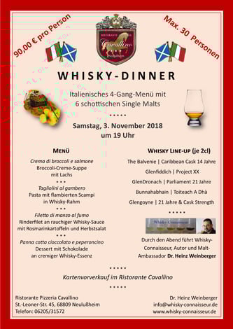 Am 3. November 2018 fand im Ristorante Cavallino in Neulußheim ein italienisches 4-Gang-Menü mit sechs korrespondierenden, schottischen Single Malt Whiskys statt.